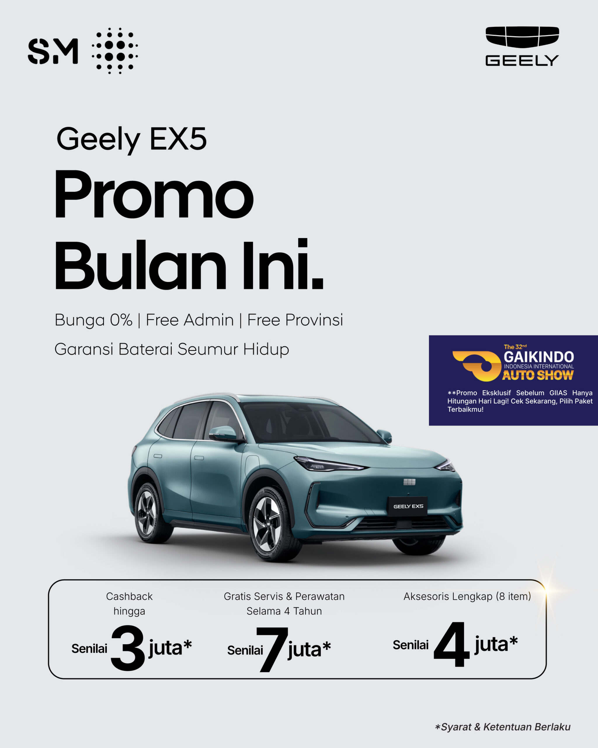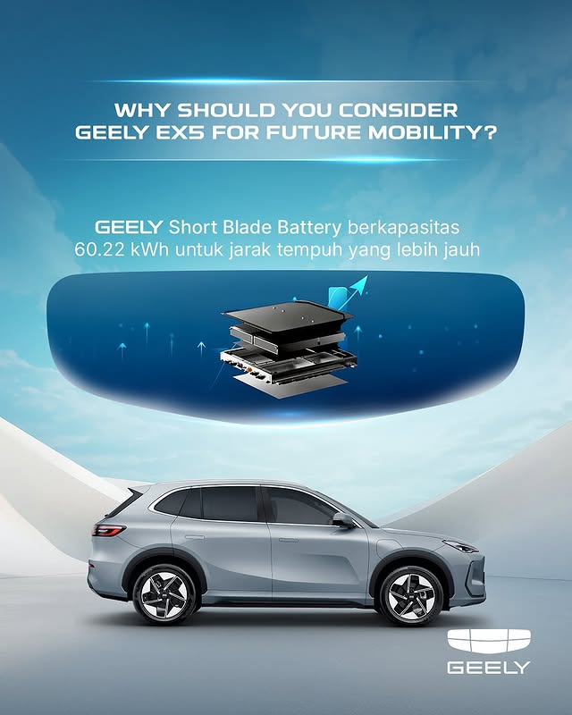 Geely EX5 adalah mobil listrik pintar dari Geely yang dirancang untuk mobilitas modern. Dilengkapi fitur canggih, desain futuristik, dan tenaga listrik penuh yang ramah lingkungan.